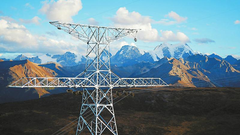 在四川甘孜州色炯玛山,金上—湖北特高压工程海拔最高塔开展放线工作。 国网四川省电力公司供图
