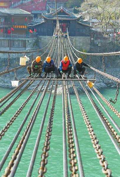 横跨大渡河300多年的泸定桥在冬日的寒风中迎来全面“体检”。12月9日,全国重点文物保护单位泸定桥检修维护启动。图为12月17日,工人正在泸定桥上进行除垢清理并涂抹黄油防护保养。 四川日报全媒体记者 李向雨 摄