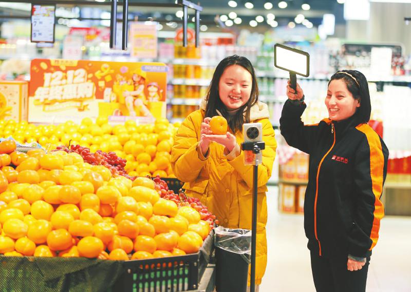 12月21日,在乐山市五通桥区汤家坝村,火红的柿子挂满枝头,游客穿梭林间拍照游玩,分享丰收喜悦。