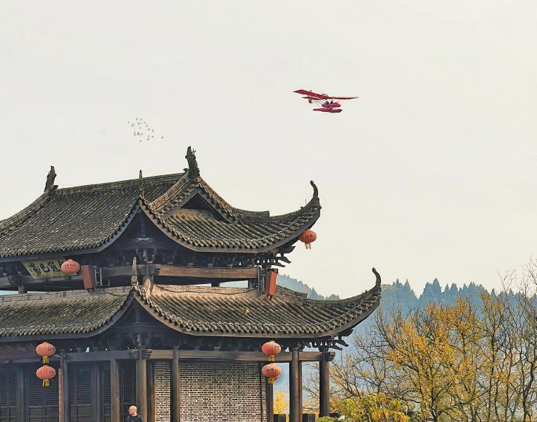 12月6日,阆中古城被金色点缀,游客们乘坐低空飞行器,赏古城冬日美景。