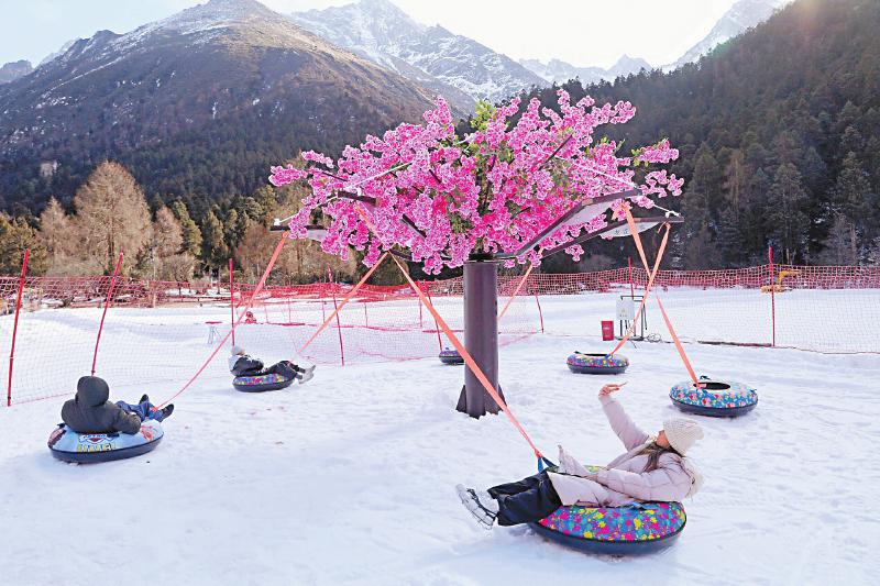 12月10日,阿坝州理县毕棚沟月亮湾冰雪娱乐场全新上线,游客们在体验雪地旋转项目。
