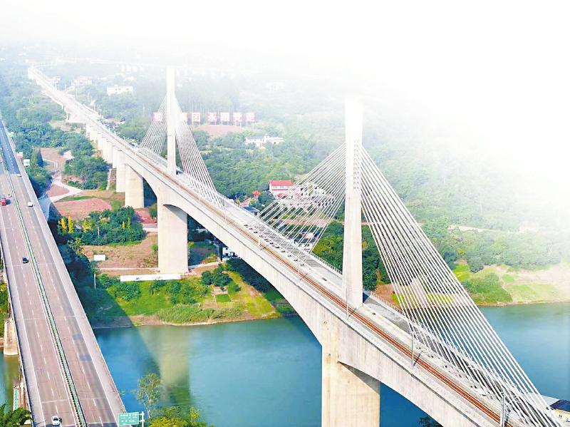 隆泸叙铁路上的泸州金山沱江铁路大桥,是国内最大跨度的铁路单索面斜拉桥。四川日报全媒体记者 周宝 摄 本报制图/朱濉