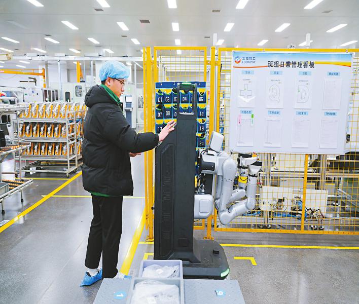 身高约1.7米的轮式机器人穿梭在富临精工的流水线间。 四川日报全媒体记者 郝飞 摄