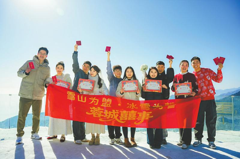 1月9日,5对新人在“成都最高婚姻登记点”留影。 西岭雪山景区供图