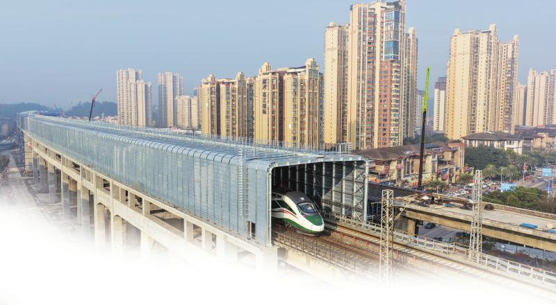 全国首例在既有运营铁路上增设的全封闭声屏障工程——达成铁路遂宁段全封闭声屏障项目,于近日完成全部安装工作。该工程位于达成铁路线遂宁站东侧,是新建成达万高铁配套改造工程的关键部分,全长967米,地处居民密集区、场地狭小,吊装超40米高,仅能在每周四凌晨“天窗点”作业。中铁十局历时10个月,在64个“天窗点”完成3300吨钢架、3万平方米屏体的安装。 刘昌松 摄(C视觉)