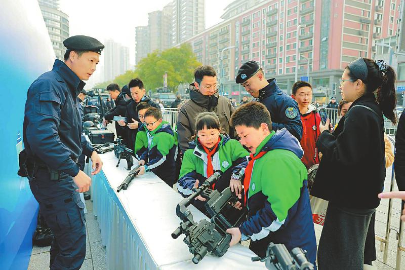 1月10日,成都公安举办警营开放日活动,孩子们在现场体验警务装备。 成都市公安局供图