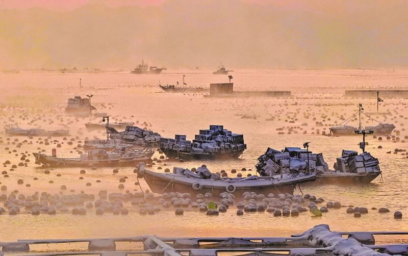 1月12日,雪后的山东省荣成市爱伦湾海洋牧场出现“海浩”景观。“海浩”景观是一种在严寒天气下出现的自然奇观,表现为海面或湖面上水汽蒸发后遇冷凝结,形成白茫茫的雾气,如同水面沸腾一般。
