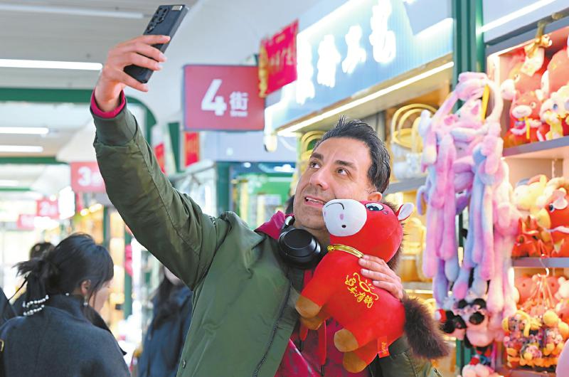 来自芬兰的外商与“哭哭马”公仔玩具合影。