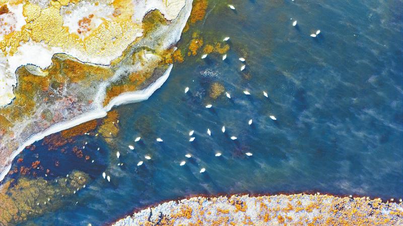 1月21日,从空中垂直拍摄的阿坝州若尔盖县麦溪乡天鹅湖,宛如一幅展开的绚丽画卷。因地热而终年不冻的水面,在阳光下闪烁着粼粼波光。成群的天鹅散布在蓝色的湖面上,或悠闲地游弋,或低头觅食,或振翅欲飞,仿佛是绣在绸缎上的朵朵白花。 李旭 摄(C视觉)