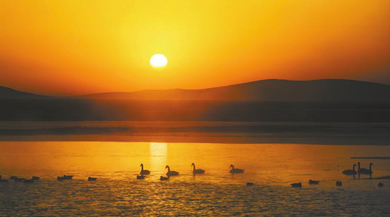 破晓时分,霞光漫过山头,一群天鹅在湖边嬉戏。