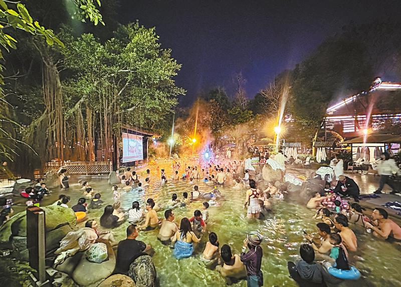 1月23日晚,在成都都江堰市青城山脚下,游客们一边泡温泉,一边观看露天电影。