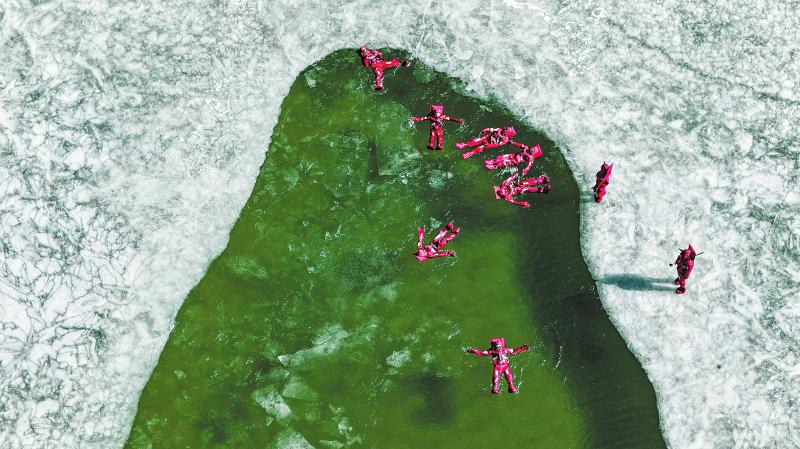 1月23日,游客在康定市木格措景区体验浮冰项目。