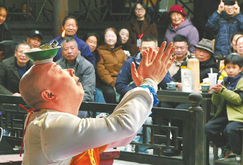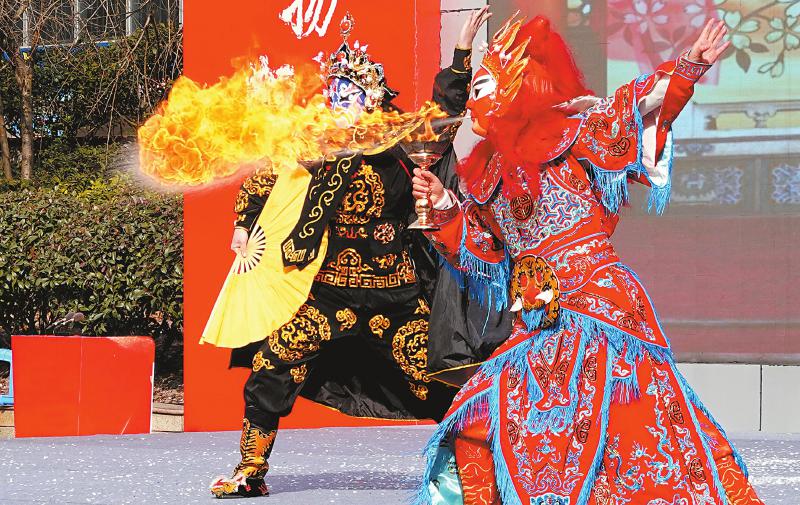 一月二十七日,巴中市文艺工作者在表演川剧吐火绝活。肖定怀摄(C视觉)