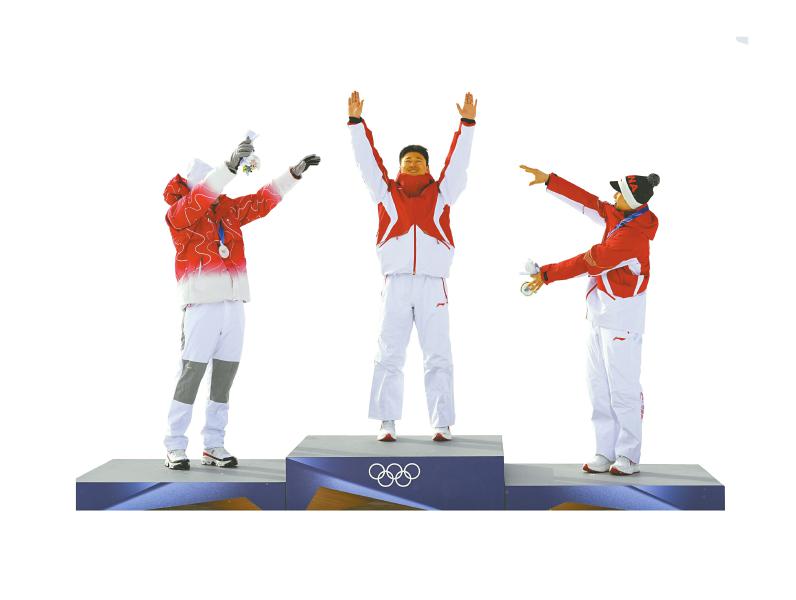 中国选手王心迪(中)、亚军瑞士选手罗特(左)和季军中国选手李天马在颁奖仪式上庆祝。 新华社记者 邬惠我 摄