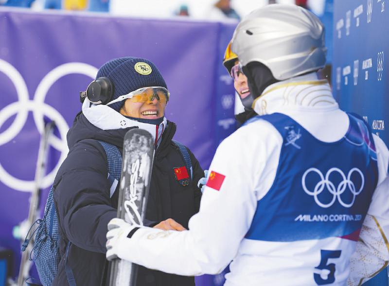 王心迪与妻子徐梦桃(左)在决赛间隙。新华社记者 胡超 摄