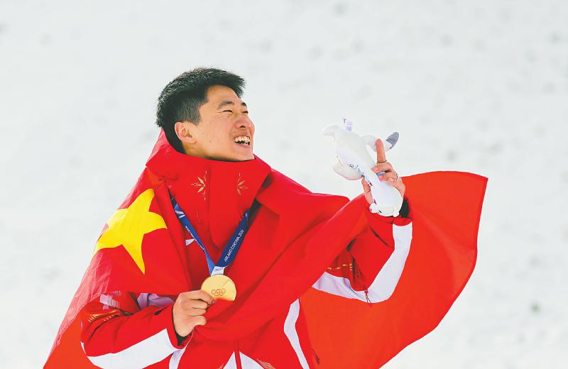 北京时间2月20日晚,米兰冬奥会自由式滑雪男子空中技巧决赛在利维尼奥滑雪公园结束。中国选手王心迪以132.60分摘得金牌,这是中国代表团本届冬奥会获得的第4枚金牌。王心迪的妻子徐梦桃此前已拿下女子个人赛冠军,如今夫妻俩双双收获金牌,成就一段佳话。图为王心迪在颁奖仪式上。 新华社记者 邬惠我 摄