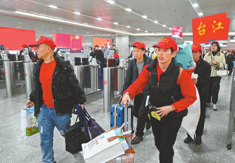 福州 2月24日,来自贵州省的400名务工人员乘坐G2414次贵阳北—福州免费高铁返岗复工专列顺利抵达福州火车站。此次开行的“点对点”务工人员返岗专列,是福州市2026年“春风行动·就业援助季”重点举措之一,旨在全力保障企业节后复工复产,畅通务工人员返岗通道。新华社记者 林善传 摄