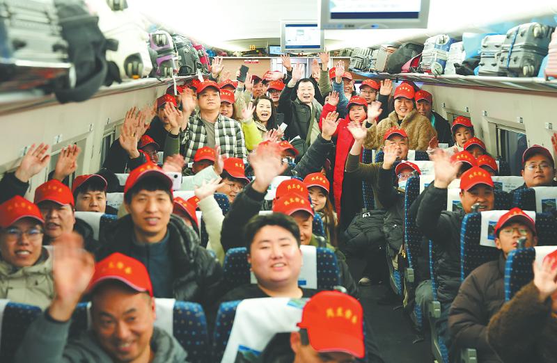 西安 2月24日,西安市2026年“春风行动”赴苏州太仓务工人员“点对点”列车发车,82名来自陕西省西安市周至县的务工人员,在西安、苏州人社部门的帮助下,免费搭乘G1922次列车,前往江苏省苏州市太仓市,奔赴各自岗位开工。 新华社记者 邵瑞 摄