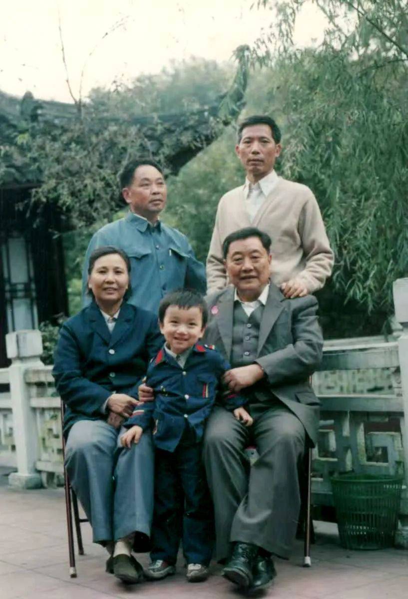 1988年,徐敬三、魏国华夫妇携外孙陆宇峰(前中)与时任海军广州基地政委魏伯良少将(后右)在乐山留影。