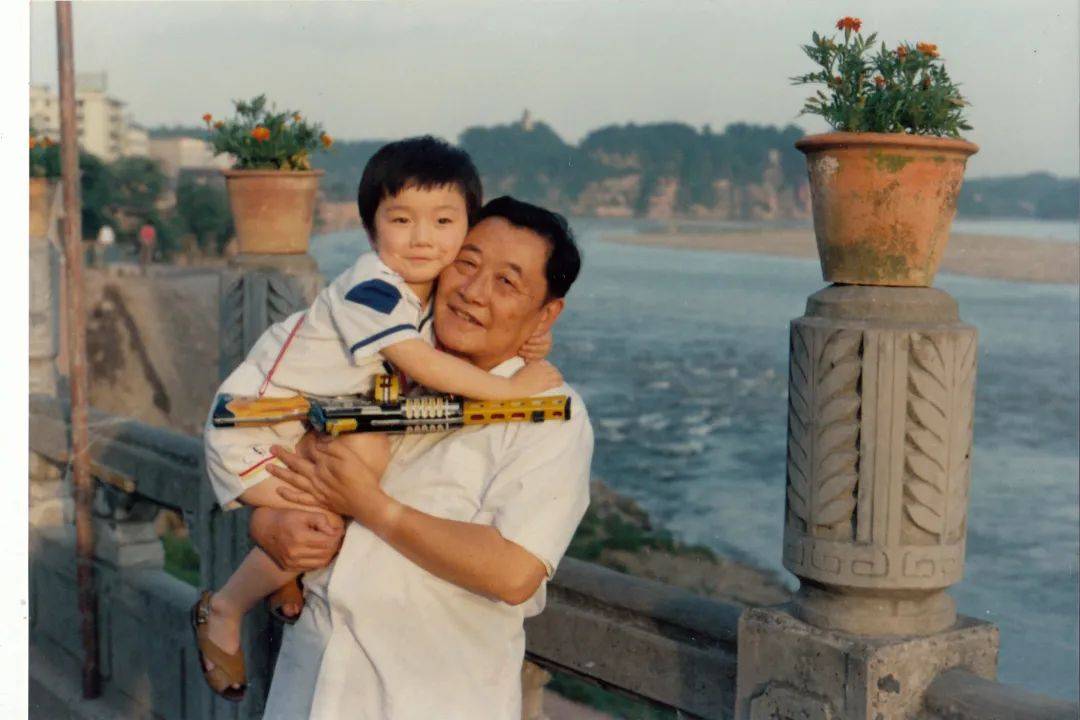 1988年,徐敬三和陆宇峰爷孙在乐山嘉州宾馆外留影。