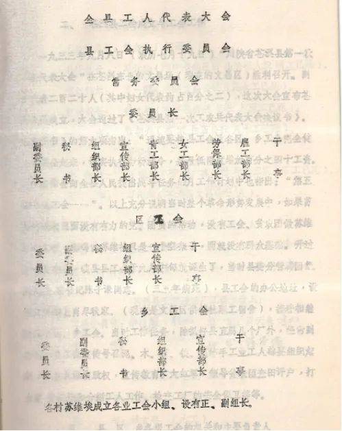 1933年9月8日,川陕省苍溪县第一工农代表大会在苍溪县东北的文昌场胜利召开,大会通过的《决议书》第六项指出:“迅速要将县工会及各区、乡工会完全建立与健全起来,切实执行劳动法令,并最低限度增加百分之四十工资。”当年9月中旬苍溪县县工会成立,接着相继建立了区、乡工会。当时工会工作的任务,除抓好县直属几个厂外,还经常到各区、乡工会宣传号召泥、木、石、铁、篾等手工业工人要组织起来保卫苏维埃政权,宣传教育广大红军,领导贫农团查田评户,打土豪分田地和介绍工人工作、检查工厂的安全保卫等。红军来后,在苏维埃政府发展工业生产的方针和政策指引下,为支援前线和建设苏维埃政权机关的需要,分别办起军工厂、制服厂、斗笠厂、造船厂、制鞋厂、渔业社、火药局等。