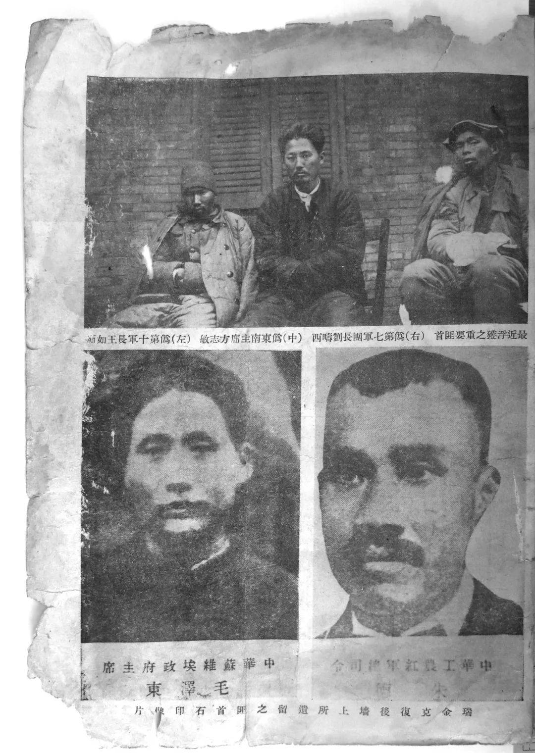 从《老实话》的封三还可以看到,在毛泽东和朱德的照片下方,清清楚楚地写着一行说明文字—“瑞金克复后墙上所遗留之匪首石印像片”。从这一行说明文字中,不用分析,我们就可以得出这样一个结论:这两张照片显然是当时红军领导人的标准照。
