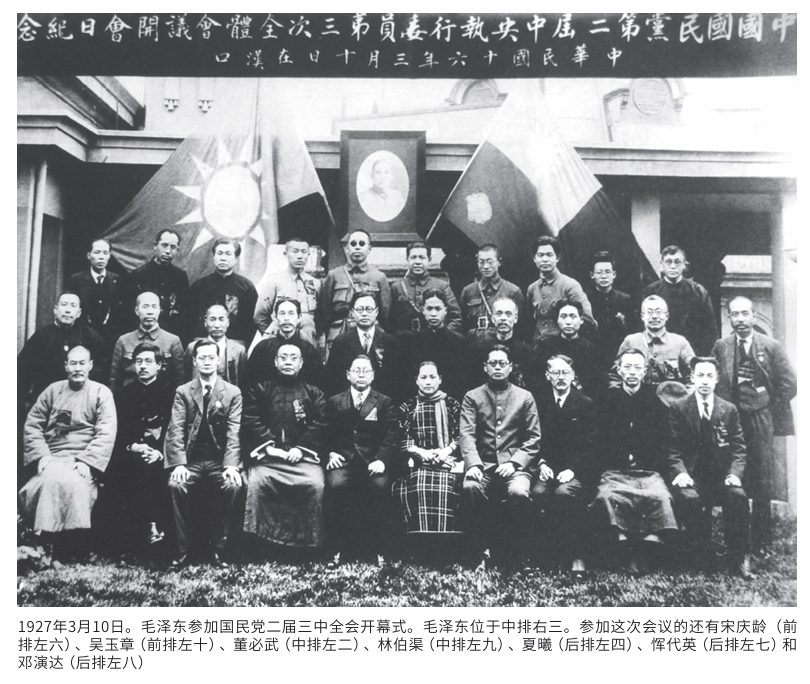 经考证,笔者认为拍摄于1927年3月10日。这一天,毛泽东参加了国民党二届三中全会开幕式,并拍摄了合影留念。在这张合影中,毛泽东站在中排右边第三位。参加这次会议的还有宋庆龄(前排左六)、吴玉章(前排左十)、董必武(中排左二)、林伯渠(中排左九)、夏曦(后排左四)、恽代英(后排左七)和邓演达(后排左八)。
