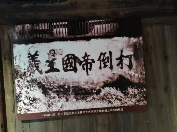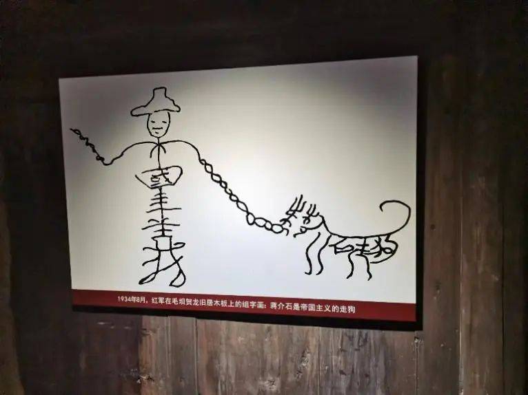 木黄会师纪念馆展出的展品中,除了王昭均记录的多首“红军歌”歌词,还有红军标语、枪支子弹和苏维埃政府木印、苏维埃银行发行的纸币、贺龙赠送黔东独立师师长冉少波的蚊帐、军毯(蚊帐和军毯为仿品)以及红军使用过的生活用具、村里墙上写的“打倒国民党”“打倒帝国主义”“蒋介石是帝国主义的走狗”等标语照片、粘贴的宣传画等。这些展品背后反映出当年根据地扎实的群众基础,也反映出红军重视对老百姓进行红色文化的教育和宣传。以汉字+图画的方式书写标语,足可以看出当年党的宣传工作做得深入浅出,通俗易懂。由此特殊现象可以说明,红二、红六军团木黄会师后,黔东一带的根据地建设是相当出色的。