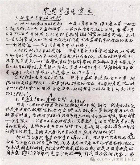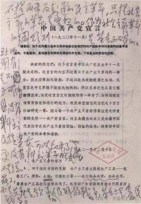 毛泽东后来在《党史资料汇编》上读到了这篇《中国共产党宣言》,并写了一段重要批语:“不提反帝反封建的民主革命,只提社会主义的革命,是空想的。作为社会主义革命的纲领则是基本正确的。但土地国有是不正确的。没有料到民族资本可以和平过渡。更没有料到革命形式不是总罢工,而是共产党领导的人民解放战争,基本上是农民战争。”