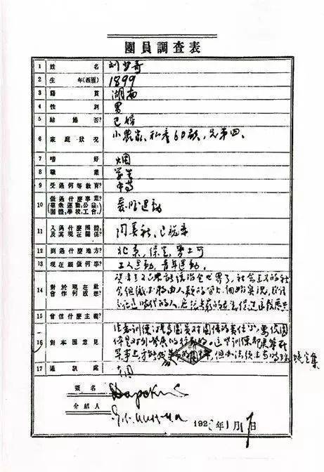 刘少奇1921年1月17日填写的中国社会主义青年团团员履历调查表