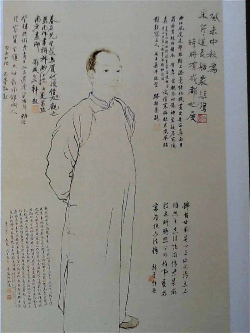 据画界称,徐悲鸿为他人全身造像不多,仅张大千、张釆芹等数件。徐悲鸿在这幅白描人物造像中,熔古今中外技法为一炉,张釆芹在画中神情自然逼真,姿态生动自如,活脱脱的展现了一个真实釆芹先生,也呈现了徐悲鸿大师的中西方传统技法的深厚功底,大师用中国白描勾勒人物外形及衣纹处理又巧妙运用西方绘画技法,侧重于透视关系、解剖比例、明暗关系,在构图、人物形态、骨骼表现方面达到淋漓尽致的程度显示了极高的艺术技巧和广博的艺术修养,是古为今用,洋为中用的典范。徐悲鸿以天才智慧,坚毅的精神,无愧为中国近现代能全面掌握东西方绘画的艺术大师。