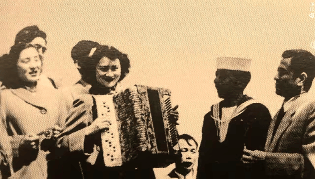 1956年,庄志军女士(左二)在埃及尼罗河游船上演奏手风琴,右一为原新疆军区文化部部长,后来担任总政文艺处处长的马寒冰,他是传遍全国的歌曲《新疆好》的词作者。