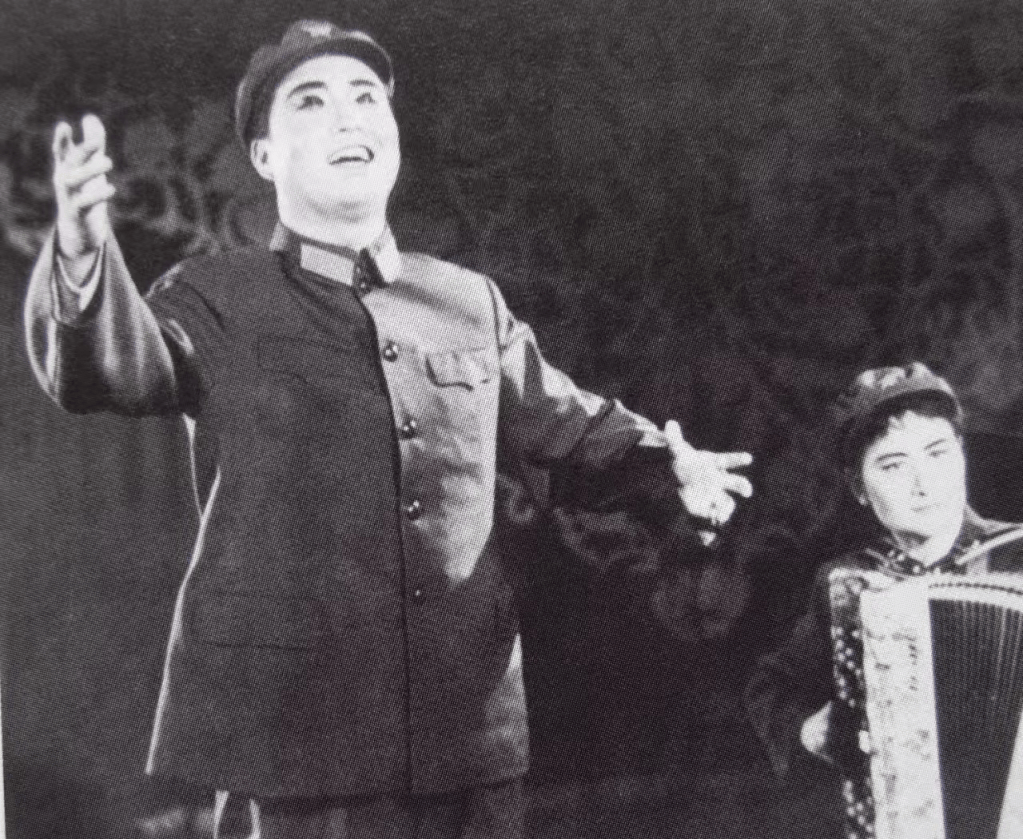 1972年在全军文艺会演中演唱的李双江先生,右一手风琴伴奏为庄志军女士。