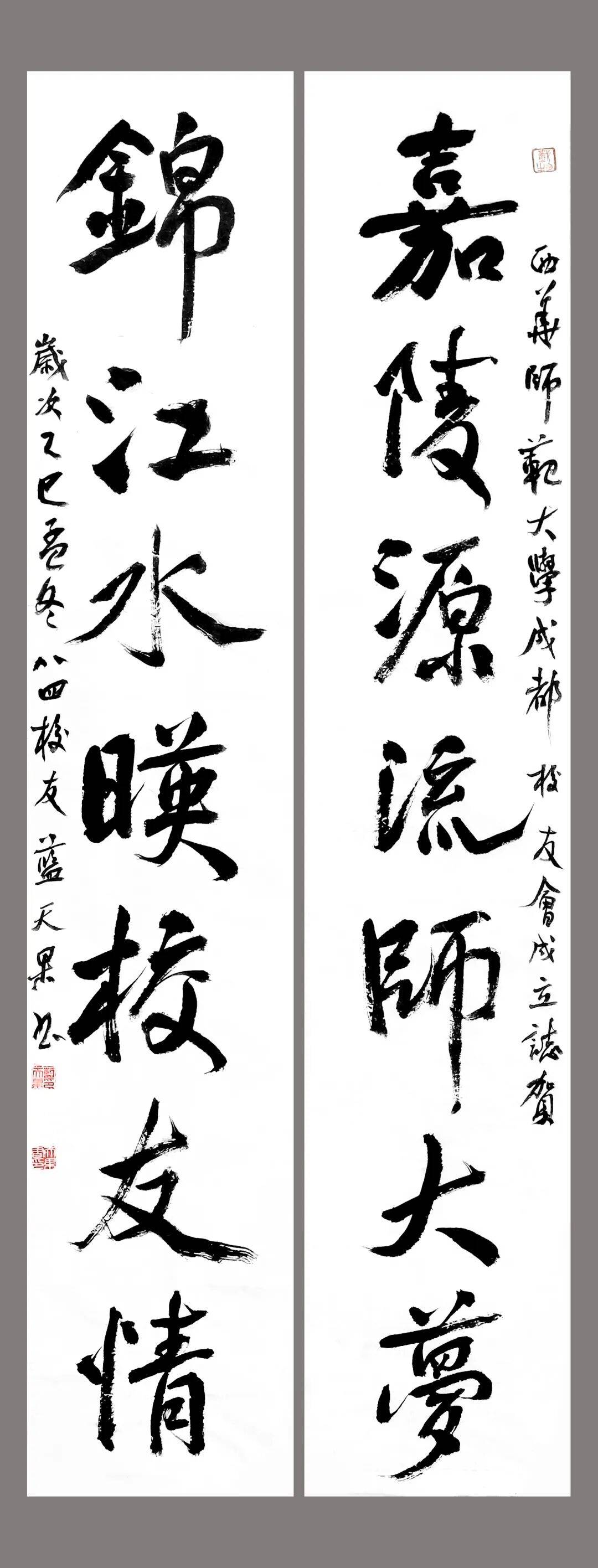 这些年,我和四川蓝天书画院的同仁们始终致力于力所能及的公益事业。我们以书法教育为纽带,帮扶民族地区与偏远校园,让传统文化浸润更多角落。2023年,我们向甘孜州石渠中学捐赠了一批书画作品,成为书画艺术援藏区教育的践行者;2024年,团队不远千里奔赴陕西省神木市第十三中学,举办了一场意义非凡的书法作品捐赠仪式,现场为学校送上精心创作的书法作品;2025年,我们走进红色巴中,助力乡村文化艺术发展,并向关渡小学捐赠了书法教材与作品。此外,我们还联合社区开展老年书法公益课,圆了不少老人的书法梦;每逢春节,组织师生走进社区、敬老院,挥毫泼墨写春联、送福字。这些事虽平凡,却能让书法艺术走出学堂,真正融入寻常百姓的生活之中,也让我们在担当社会责任的过程中,更深刻领悟书法艺术的价值与意义。