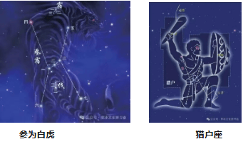 在二十四史的《天文志》中,参宿多记载为:参,白兽之体,其中三星横列,三将也。东北曰左肩,主左将;西北曰右肩,主右将;东南曰左足,主后将军;西南曰右足,主偏将军。古代星象学书籍《黄帝占》云:参应七将。参宿被列代天文志认为是白虎的化身,也是主将军、战争、打仗的星象。尤其是参宿中间的三颗主星被认为是三个大将军,非常神奇的是,中国的参宿即是西方天文学星座里的猎户座,猎户座是冬夜星空最为壮丽的星座,也是西方星座里非常有名的一个星座。参宿中间的三颗主星是西方猎户座猎户形象的腰带,那里挂着征战所用的宝剑。在古代大规模的狩猎活动往往与战争相通,因此参宿无论是白虎之象还是征战的将军之象,都有狩猎与战争的含义。