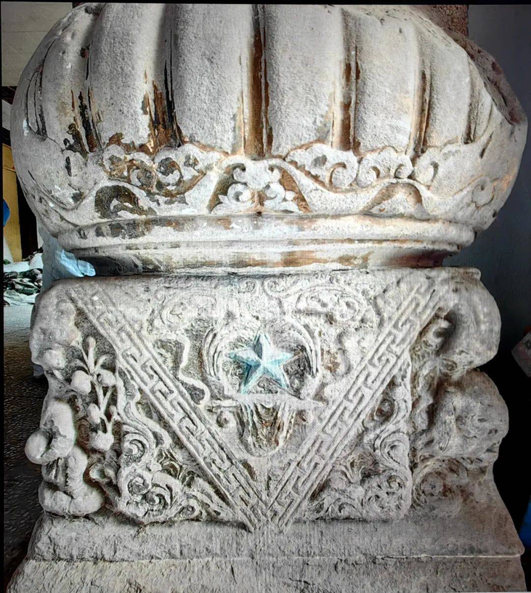 经实地考察可见,川北行署礼堂门厅设置的两根圆形立柱,基座采用了当地山区的白细砂石料,上部呈鼓状圆形,雕刻着吉祥花卉云纹图案。下部石基为四方形状,石基每一面都雕刻着寓意美好的图案,如“骑鲸跨鳌”“蟠桃献瑞”“龙飞凤舞”“五福临门”等。这些图案的雕刻工艺精湛,每一处都栩栩如生,给人留下深刻印象。基石细节处尤其精妙,仿刻的盖毯垂下的三角形中的花卉,不仅非常生动,还仿佛让人感受到蚕丝绒一般的柔软。半镂空雕刻的跨鳌童子,稚气可爱,笑容可掬。瑞兽珍禽,呼之欲出。灵芝寿桃仙草,寓意福祉绵绵,人寿年丰,长安吉祥。因基座石刻有不同程度的风化碰损,有些图案模糊不清,残缺不全,令人惋惜。