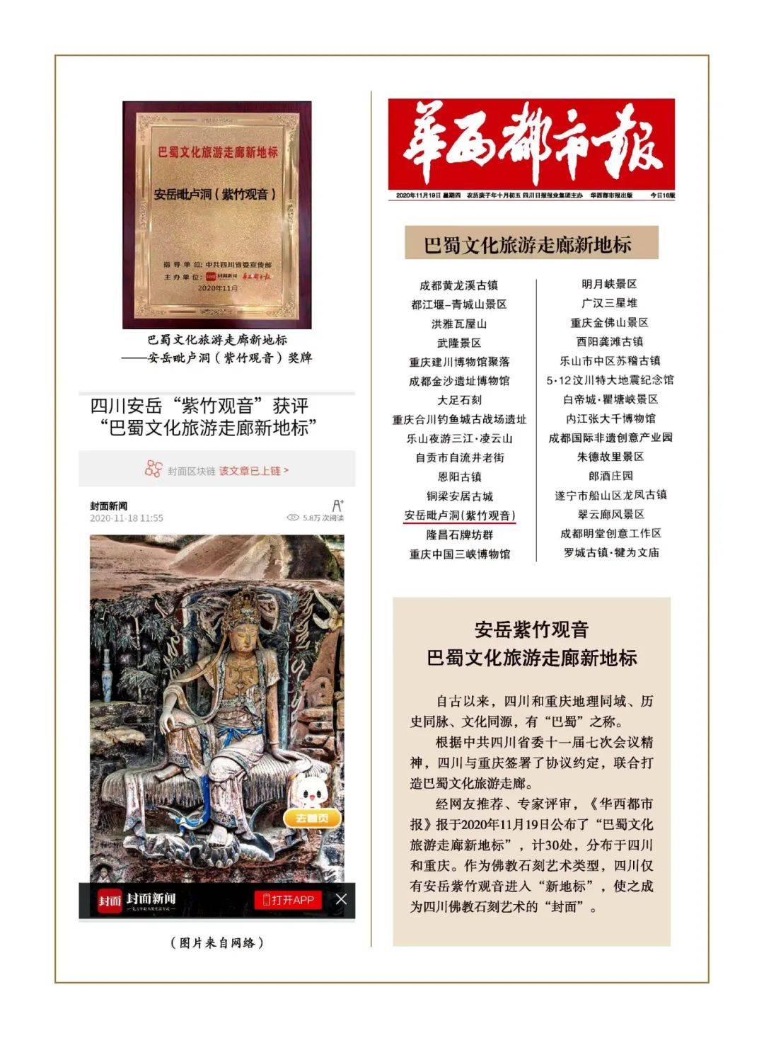 2020年11月,安岳毗卢洞(紫竹观音)获评“巴蜀文化旅游走廊新地标”。