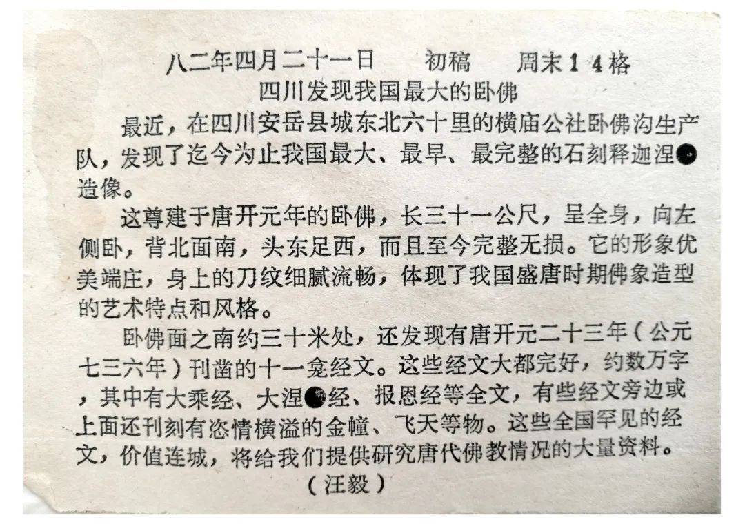《四川发现我国最大的卧佛》汪毅文,中央人民广播电台播出,1982年5月9日。为国家级媒体第一次报道。