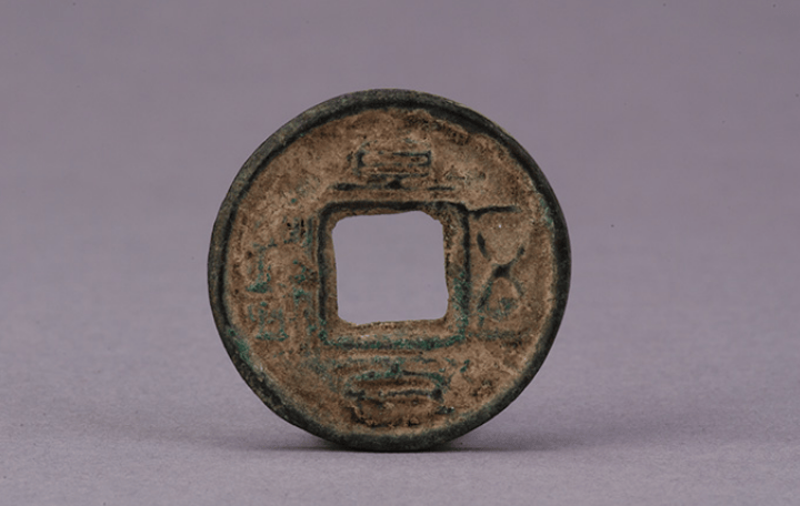 三级文物,三国蜀汉钱币。直径2.7厘米,穿径1厘米,厚0.25厘米。圆形方穿,内外皆有廓,面文隶书“直百五铢”,钱背左侧隶书“为”字,表面有锈蚀。