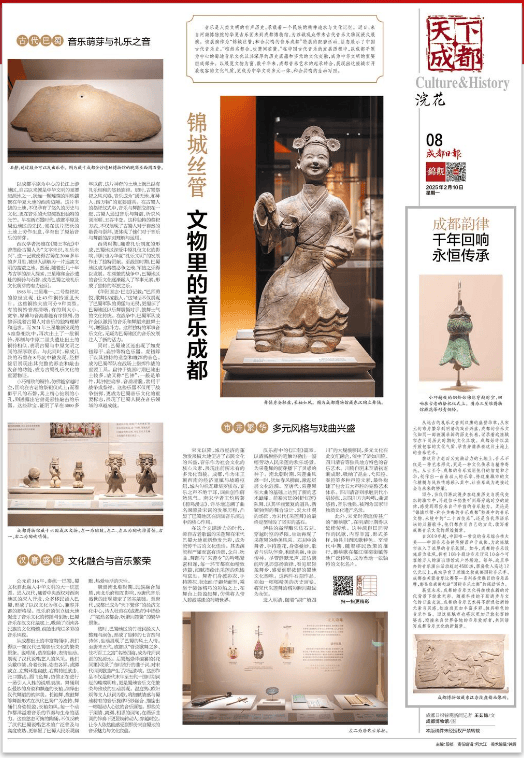音乐是人类文明的有声历史,承载着一个民族的精神追求与文化记忆。近日,来自河南博物院的华夏古乐团来到成都博物馆,为蓉城观众带来古代音乐文物沉浸式展演。该展演作为“锦城丝管:和合共鸣的音乐成都”特展的配套活动,活态展示了中国古代音乐史。“喧然名都会,吹箫间笙簧。”在中国古代音乐的发展历程中,以成都平原为中心的蜀地音乐文化以其深厚的历史底蕴和多元的文化交融,成为中华文明的重要组成部分。以展览文物为窗,数千年来,成都音乐艺术的起承转合,展现出这座城市开放包容的文化气质,更成为中华文明多元一体、和合共鸣的生动写照。