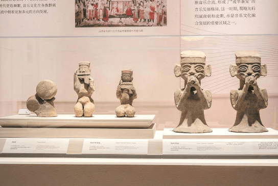 成都博物馆藏十六国成汉文物,左一为陶鼓,左二、左三为陶吹排箫俑,右一、右二为陶吹哨俑。