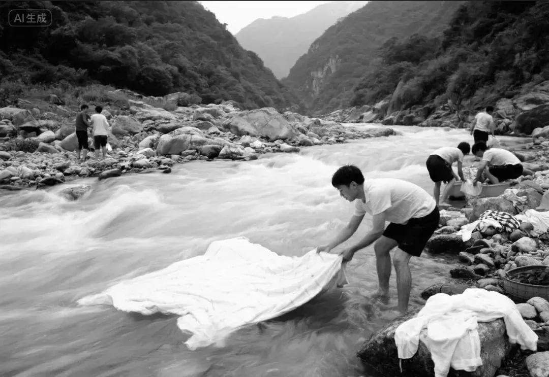 在山沟小溪里洗衣服(图片系网络AI生成)