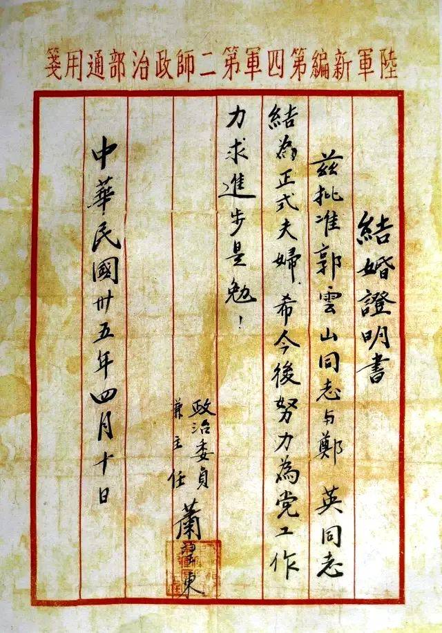 1946年4月,经新四军政委萧望东批准,郭云山、郑英结为夫妻。