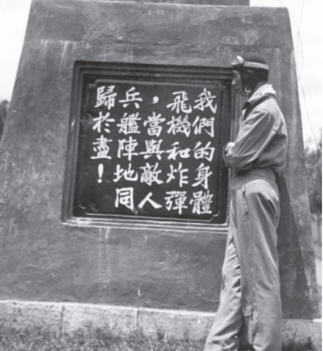 航校学员与刻有中央航校校训的石碑合影(王国平 供图)