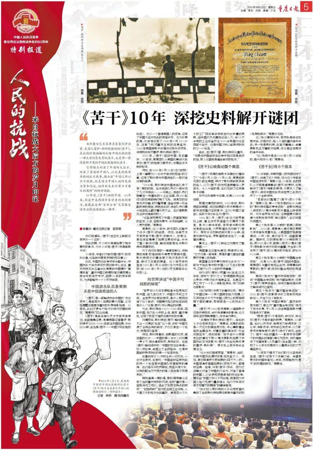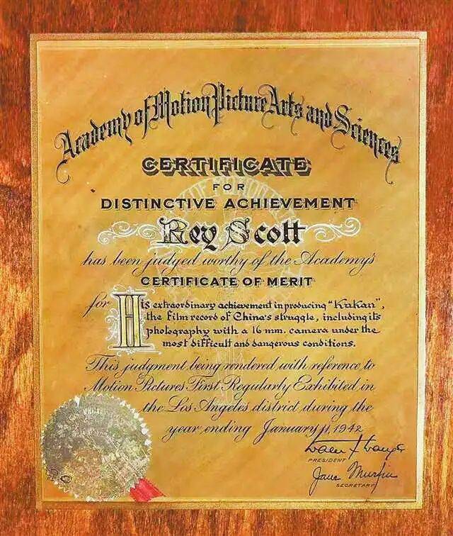 “奖牌授予斯科特和《苦干》,由他的儿子马克保存至今。”周勇说,奖牌的底板是一尺见方的黑色橡木板,中心镶嵌着金色的金属证书,印着庄重的黑体字“杰出成就证书”,颁奖词是:“授予在十分艰苦危险的情况下用16毫米摄影机拍摄了中国抗战实况的影片《苦干》作出优异成绩的雷伊·斯科特”。橡木板上有评委会主席签名。