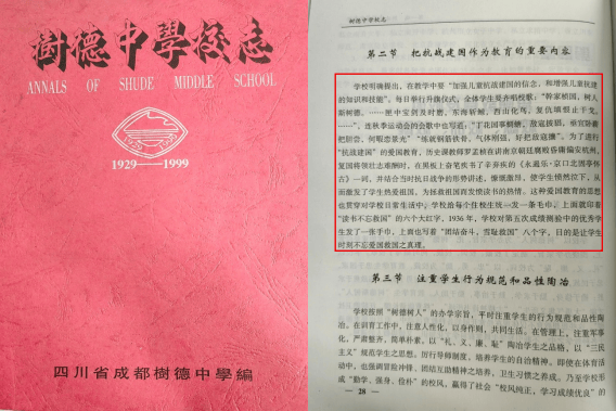 成都树德中学诞生于1929年,又名四川省成都市第九中学。抗战时期,树德中学明确提出,在教学中要“加强儿童抗战建国的信念,和增强儿童抗建的知识和技能”。每日举行升旗仪式,全体学生要齐唱校歌:“幹家桢国,树人斯树德。……匣中宝剑及时磨,东海斩鲸,西山化鸟,复仇填恨止干戈……”,连秋季运动会的会歌中也唱道:“丁花国事蜩螗,敌寇披猖,亟宜卧薪把胆尝,何暇恋景光”“练就钢筋铁骨,气体刚强,好把敌寇攘。”