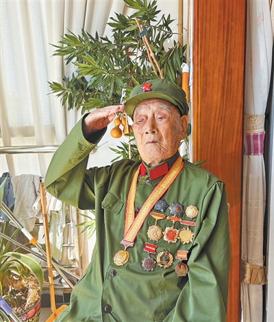9月6日上午,北京海淀,走进102岁的八路军老兵傅英(见图,本报记者徐雷鹏摄)家中,一件老军装格外引人注目。金色勋章挂满衣襟,在阳光下熠熠生辉。