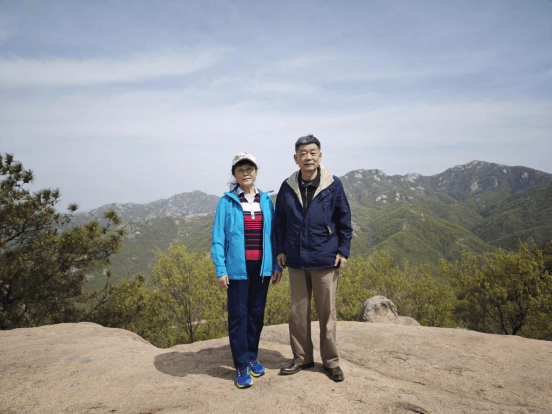 2024年4月1日,本文作者郭晓梅(左)和高鲁宁在义和寨山顶峰,前方大别山桐柏山脉,是鄂豫边桐柏山红军游击队战地。