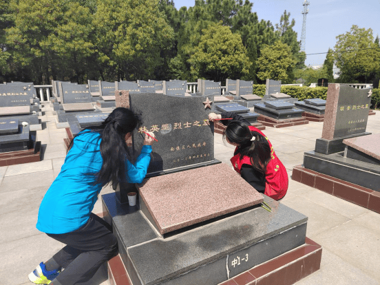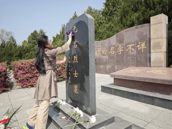 2025年4月2日,作者郭晓梅在皖东烈士陵园擦拭无名烈士墓碑尘灰。
