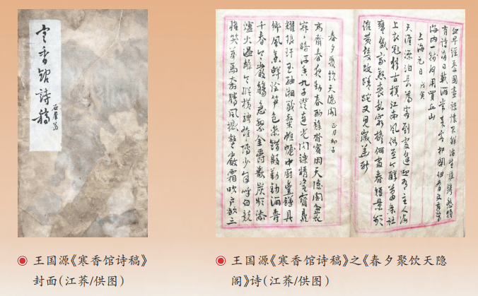 在杨庶堪诗集中,时见王仁泉其人。王仁泉即王国源,四川西充人,后任四川省博物馆研究员。他曾有一段时间与杨庶堪同时寓居上海,并师事杨庶堪习诗。王国源有诗集《寒香馆诗稿》,是一本未刊手稿,其中一首作于民国戊寅(1938)春节期间的诗《春夕聚饮天隐阁(正月初五)》,写在杨庶堪居宅“天隐阁。”宴聚所见,瓷器精美,字画古雅,川味丰醇,是少见的一首外客描绘杨庶堪上海生活的诗。以下略录诗的前半部分,可窥一斑:高斋春夜动春酌,杂沓宾朋天隐阁。盆花寂寂暗浮香,九子灯连光闪烁。精瓷宝鼎耀琅玕,玉轴湘签灿帷幄。中厨丰饍具乡风,烹鲜烩笋色参错。殷勤劝酒寿千春,寒严觞急繁金爵。兽炭频添炉火温,辞言纵横骋雄博……